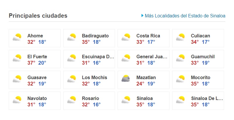 Pronóstico del tiempo Sinaloa8 abril, 2022 Pronóstico del tiempo viernes 08 de abril de 2022 Escrito por: Redacción Ruta Sinaloa SINALOA PrtoPronóstico del tiempo para hoy Facebook Comments Related posts Se prevén lluvias fuertes en…19 enero, 2026Se prevén rachas de viento…13 enero, 2026Frente frío 27 y segunda…12 enero, 2026Flossie, ahora como tormenta tropical,…3 julio, 2025Sinaloa refuerza monitoreo ante lluvias…2 julio, 2025Se pronostican lluvias intensas24 julio, 2024Se esperan vientos con rachas…26 abril, 2024Hoy se prevé la primera…13 abril, 2024Eugene ha dejado de afectar…7 agosto, 2023Lluvias y altas temperaturas se…31 julio, 2023